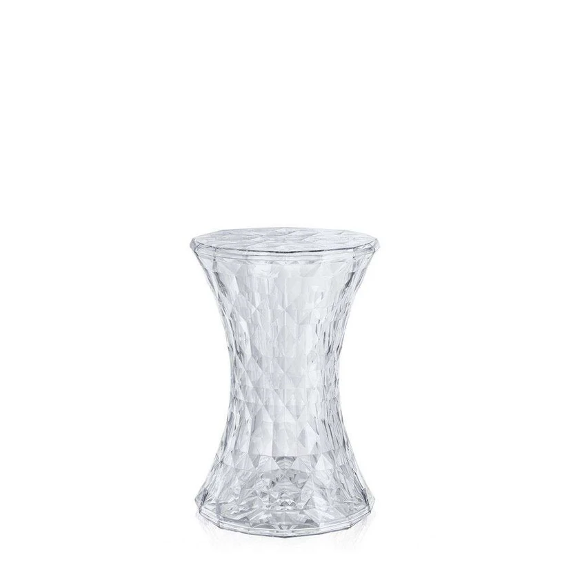 The stool is made of plastic and is transparent in a beautiful crystal shade. The shape is most reminiscent of an hourglass, but the surface has diamond-shaped cut-outs that make the stool a great gem in the interior.