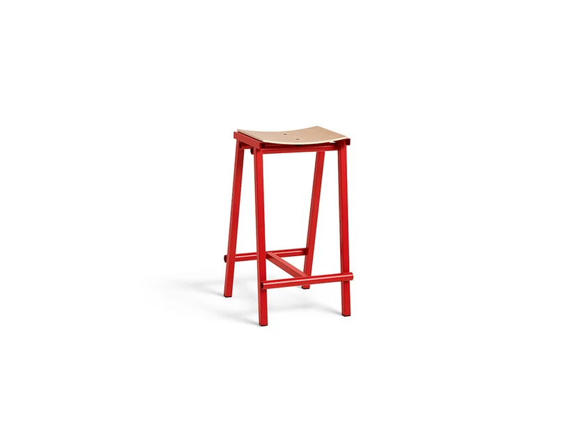 The Taburete 8 Bar Stool Low Signal Red by HAY is the perfect addition to your home or business. This bar stool, designed by Spanish designer Marc Morro, combines functionality with a minimalist look. With its powder-coated base and water-based lacquered oak veneer seat, this red bar stool offers both durability and style. The curved veneer seat and sturdy steel frame accentuate the chair's industrial aesthetic, while the bold colour adds a modern touch. Taburete 8 is available in two heights, making it versatile and easy to integrate into bars, restaurants and private homes. The comfortable seating experience combined with the simple design makes this bar stool an ideal choice for those looking to add a touch of elegance and functionality to their space.