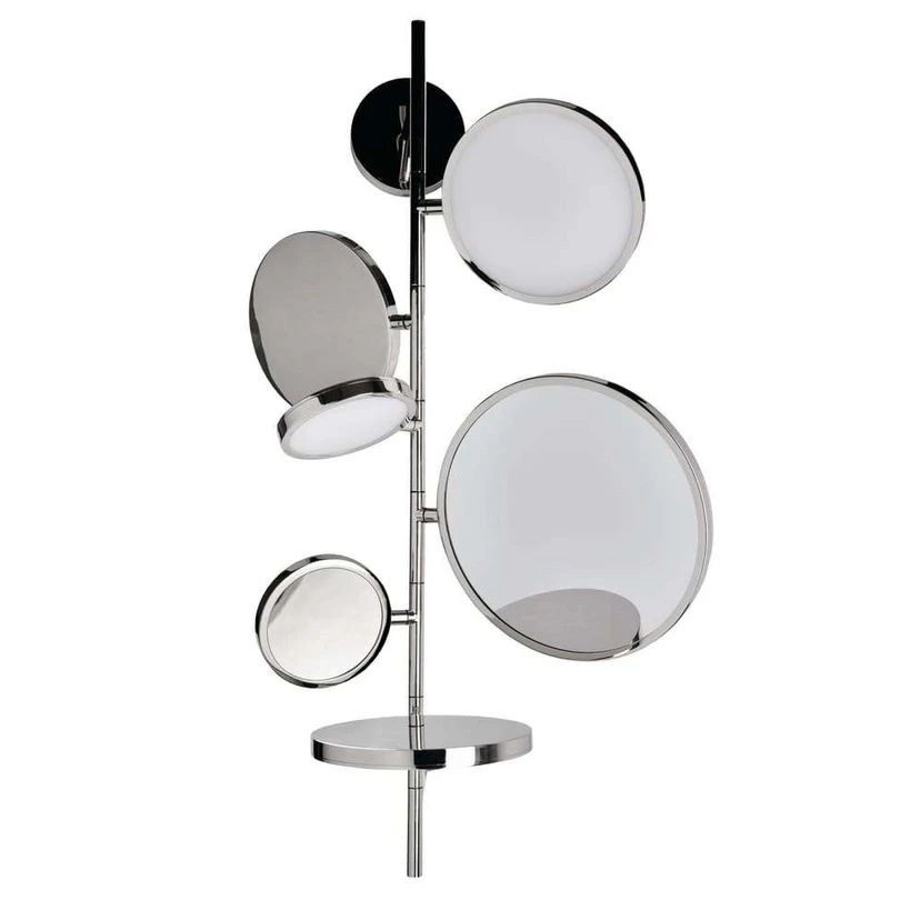 The piece of furniture is comprised of two discs that shine with dimmable LED lights, two mirrors—one of which offers 3x amplification—and two smart tables on which you can place your makeup products, beard trimmer, soap, or lotion.