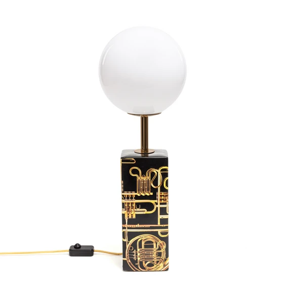 The spherical opal glass lampshade is placed on top of a porcelain base, complete with a motif that evokes an atmosphere of 50s jazz and its swing style. Choose between four different motifs—Lipstick, Snakes, Two of Spades, or Trumpets. Aside from a soft, comfortable glow, the expressive lamp adds a touch of personality to your décor whether it’s on or not. With a height of 70 cm, the lamp can be used on dressers and to light up the dark corners of your home from a space on the floor.