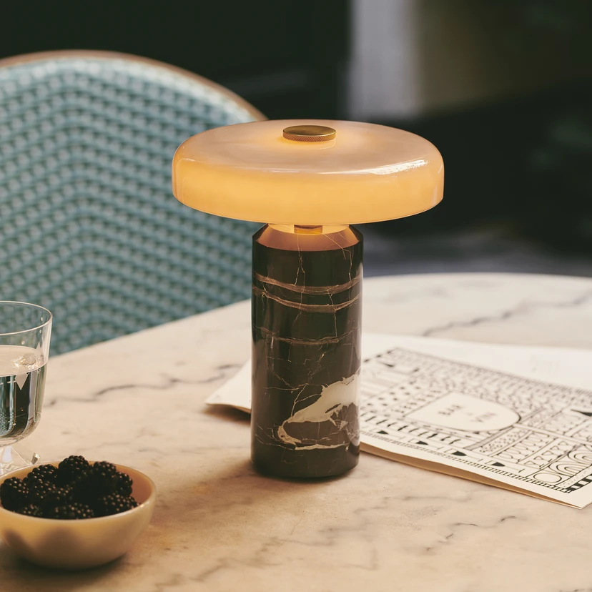Trip Portable Table Lamp Ash is a cosy and stylish yet practical and flexible creation by Danish design company Design By Us. The perfect symmetry and simple design makes the lamp look like a small mushroom and gives the lamp design an organic feel. A distinctive feature of this lamp is its solid base, which is made of genuine marble with individual veining on the surface. The lampshade is made of glass and directs the light downwards, creating a beautiful downlight that also emphasises the beautiful natural stone.