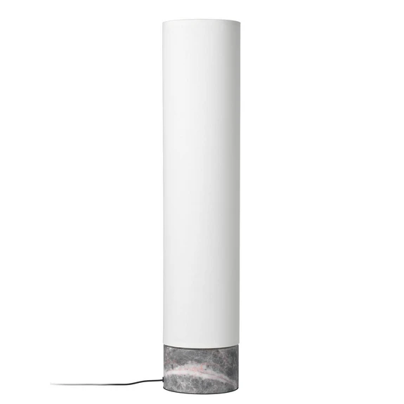 The tall, cylindrical shape and playful, asymmetrical teardrop-shape give the lamp an eye-catching and sculptural look. It emits a soft glow, making it the perfect choice for bedrooms and reading nooks. The combination of the light canvas lampshade and the dense marble base gives the lamp a sense of purposeful completeness, which is rarely seen to this extent.