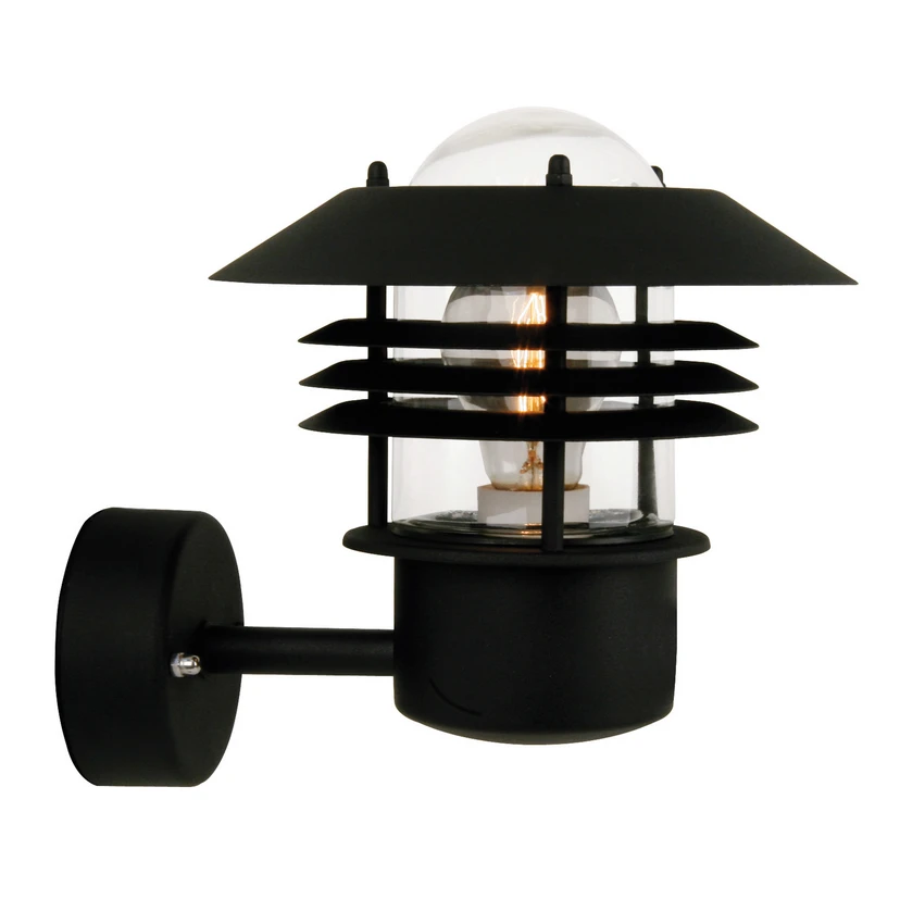Vejers Wall Light Black is a classic outdoor model with a special expression that is nostalgic and timeless at the same time. The design is characterised by a multi-layered shade that surrounds a clear glass dome where the light source is located. The transparent dome allows light to penetrate freely on all sides, while the shade panels prevent glare and gently direct the light downwards for a practical orientation light.