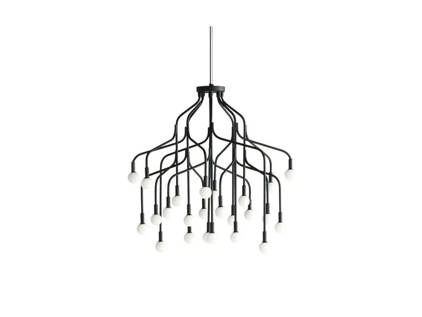 Vekst Pendant Large Black is a decorative collection of wall lights and chandeliers. The lamps are characterised by their sculptural branch-like arms, which also inspired the name of the series. The arms are made of steel with a powder coating that gives them a matte black surface that harmonises perfectly with the white opal shades. The solid metal construction combined with the soft curves and arches in the shape of the lamp and the organic design concept creates an interesting intersection between nature style and industrial design, making the lamp a strong style element in any interior.