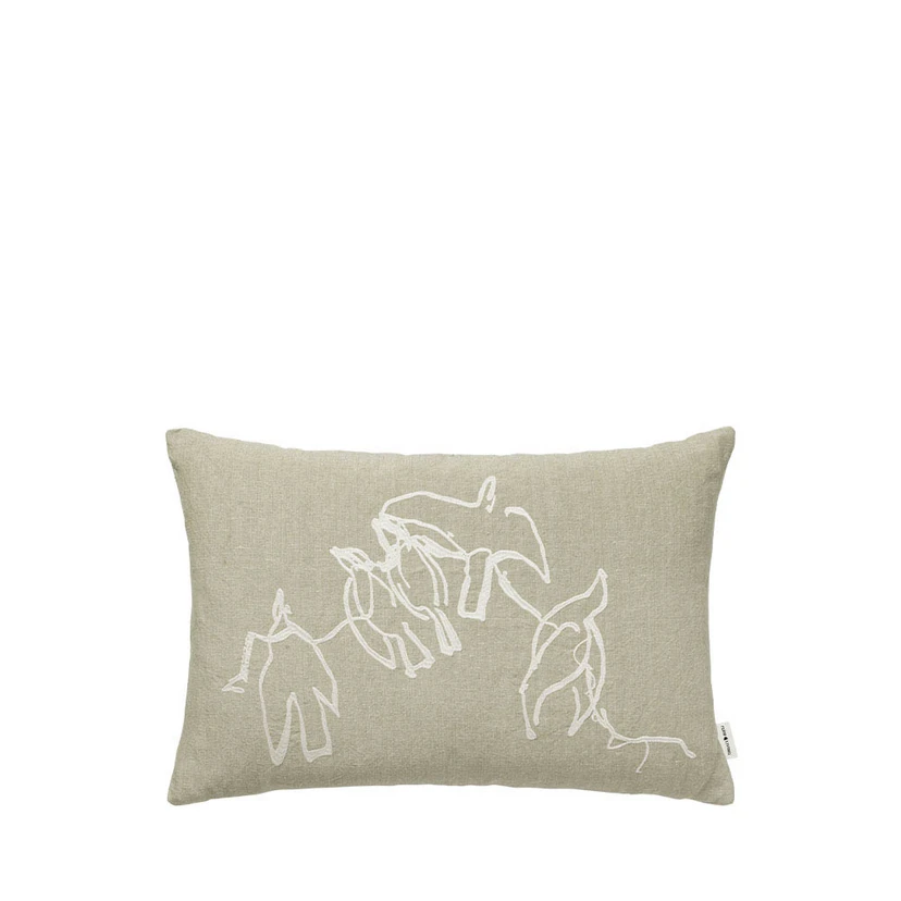 Vuelo Cushion Cover Elm Green - Ferm Living is a unique addition to your home accessories that brings an artistic and natural aesthetic into your home. Ferm Living has collaborated with Utzon to create a cushion that pays homage to Jørn Utzon's architectural masterpiece, Can Lis, in Mallorca. This cushion is a tribute to Utzon's sense of nature's forms, with embroidered artwork that reproduces his bird sketches from Can Lis.