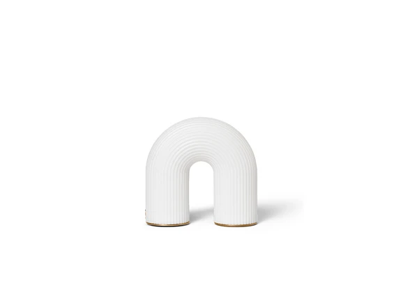 The Vuelta Portable Table Lamp White from Ferm Living is the perfect combination of aesthetics and functionality. Part of the Vuelta series, this portable lamp is designed with a sculptural arch reminiscent of antique columns, giving it a unique and timeless look. The base of the lamp is made of durable HDPE plastic, while the galvanised steel feet in brass add a touch of elegance. With a warm white LED light source that emits a soft, diffused light, you can create the perfect atmosphere in any room. The adjustable 4-step dimmer allows you to customise the brightness as needed, from a gentle night light for the nursery to subtle lighting in the living room. With an impressive battery life of up to 80 hours at 15% brightness, this lamp is both practical and versatile. Charging is easy with the included magnetic Pogo-Pin charging cable. The Vuelta Portable Table Lamp is a stylish and functional addition to your home.