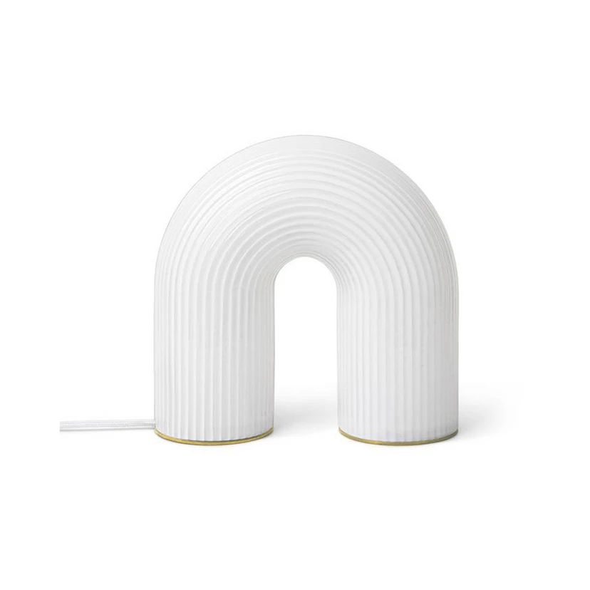 Vuelta Table Lamp White is an incredibly sculptural table lamp. The lamp is made with opal glass featuring a ruffled surface that brings to mind ancient columns. When the lamp is on, it bathes its surroundings in a soft glow and doubles as an eye-catching addition to your décor. The elegant shape stands on a brass plate, giving the lamp an unmistakeably Scandinavian touch.